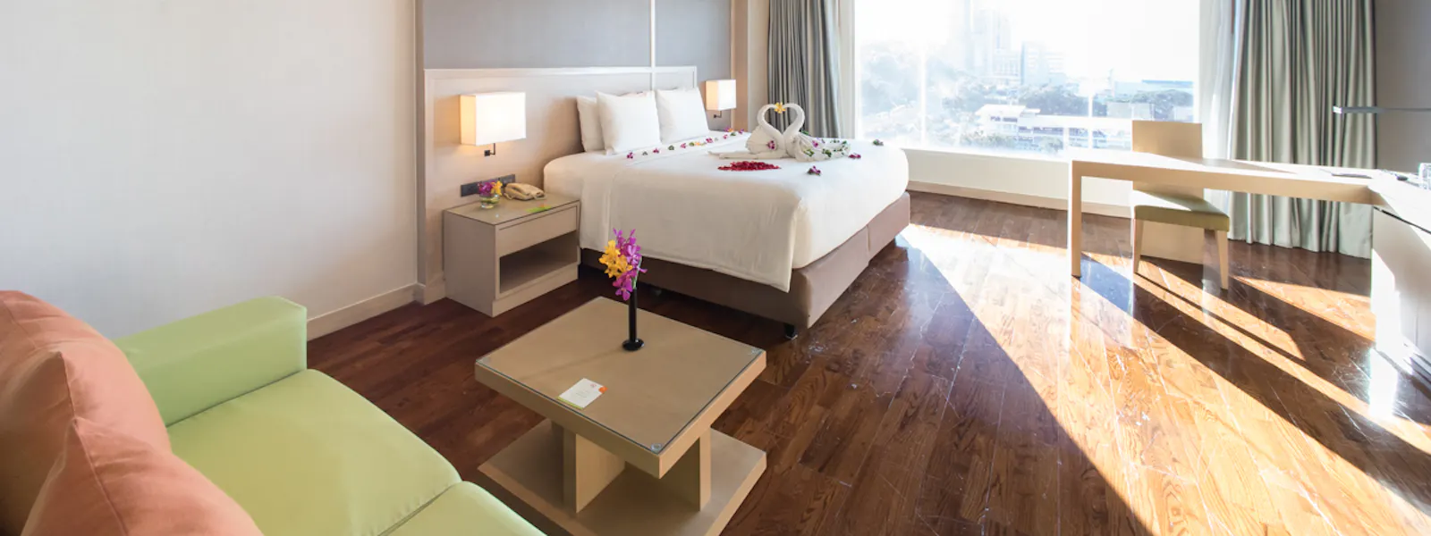 Our hotel rooms and suites effortlessly blend style and convenience for your South Pattaya visit. All accommodations feature deluxe bedding, free Wi-Fi access, and spacious, well-lit work desks. Additional amenities for your Pattaya hotel stay include LCD flat-screen TVs and laptop-sized safes. Store a snack in your mini refrigerator, or order room service and dine in your accommodations.