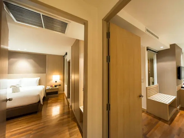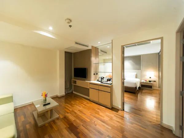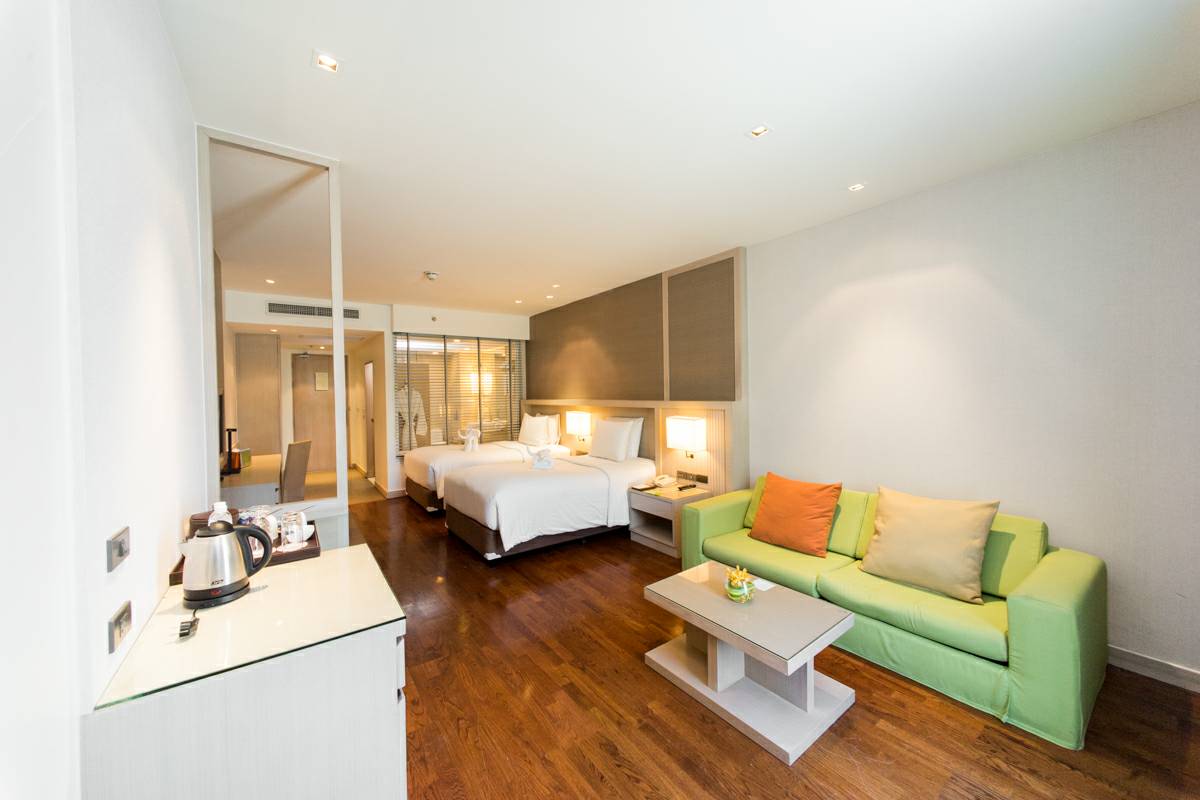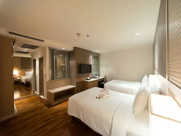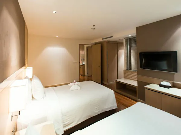 Two Bedroom Suite (75 sqm.) consist of two separate bedrooms and one living room. Each Bed room is fully equipped with all facilities and a separate bathroom. All three rooms are independently equipped. The suites feature comfortable contemporary sofas and furniture from which to enjoy the flat-panel televisions. The spacious bathroom contains a separate shower, tub, and a full supply of deluxe bathing products and plush Signature towels and bathrobes.