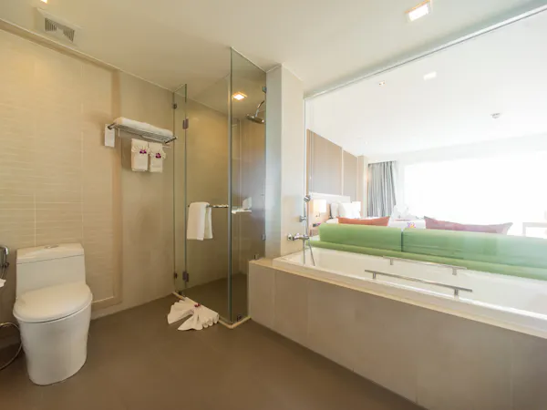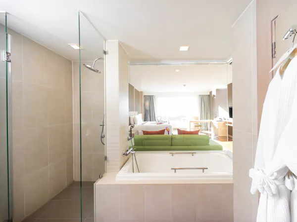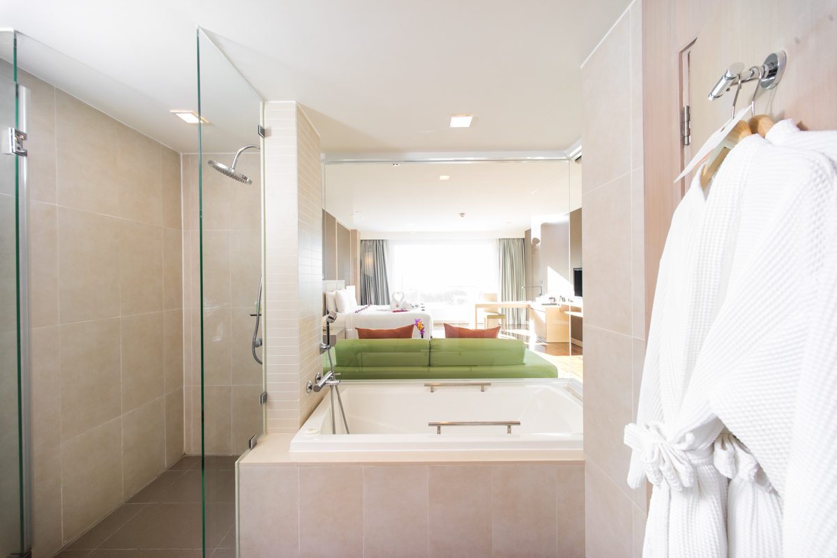 Deluxe Rooms (42 sqm.) offer a sumptuously appointed space with all modern conveniences including internet access. The bathtub and separate shower are standard features of this elegant bathroom.