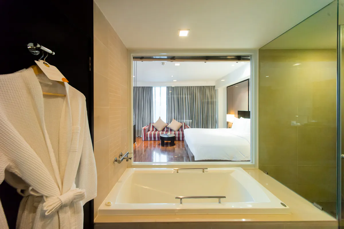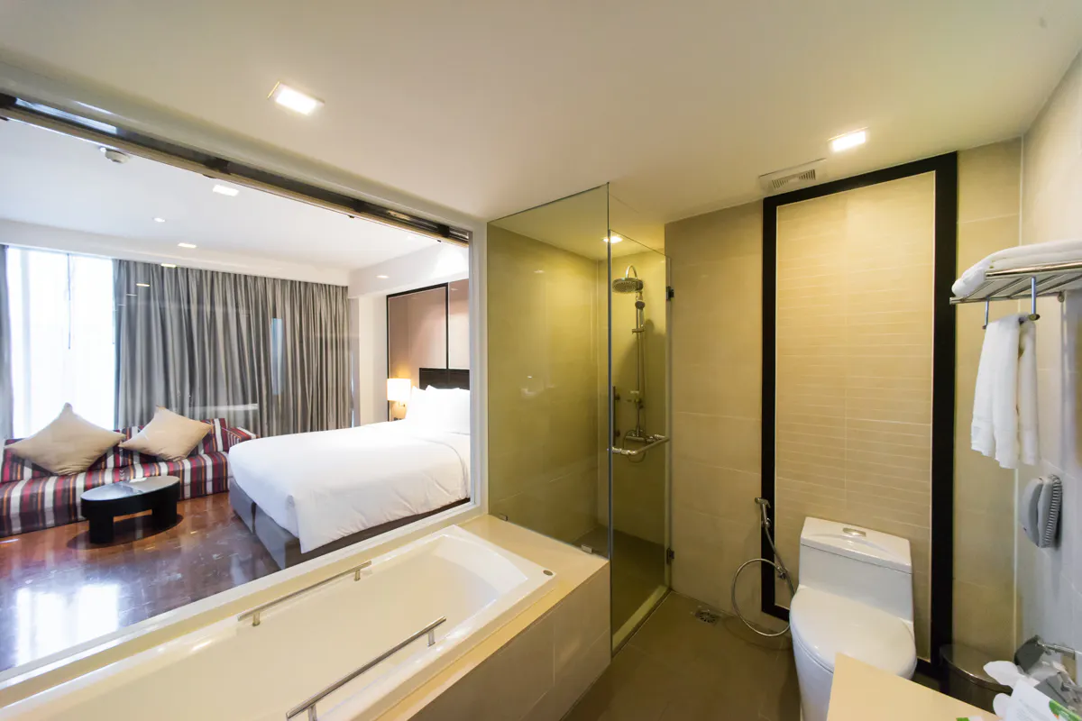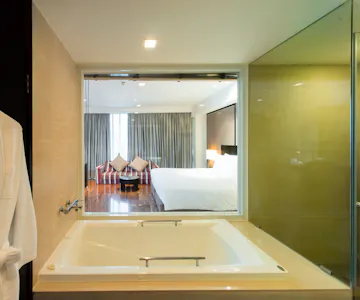 Deluxe Rooms (42 sqm.) offer a sumptuously appointed space with all modern conveniences including internet access. The bathtub and separate shower are standard features of this elegant bathroom.